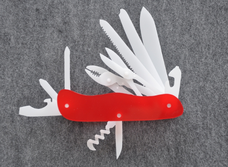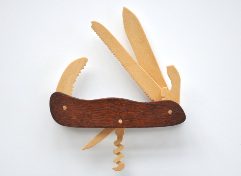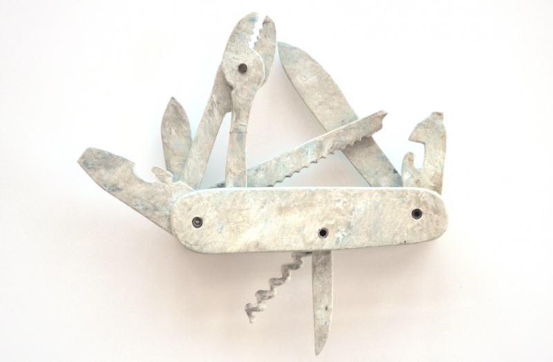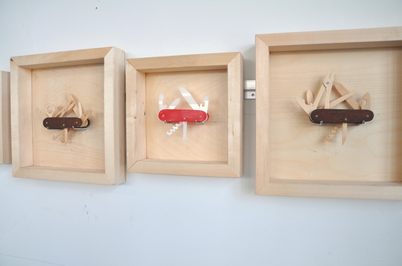 For this exhibition at Auxiliary Projects, Huang has produced The Gospel of Skills (2012), a series of 36 unique handmade interpretations of Swiss Army knives, each hand-crafted in one of four different sculpture materials (plaster, Plexiglas, metal, and wood) after nine original Swiss Army designs. For these, James adopts their original disturbing nomenclature such as “Executive,” “Hunter,” and (curiously) “Manager.” In the ordinary life most city dwellers enjoy most of the time, utility knives may be used to open a beer or cut off a plastic sales tag. How much less useful is a felt knife? Or as the designer Charles Eames asked in 1972, “Who would say that pleasure is not useful?”